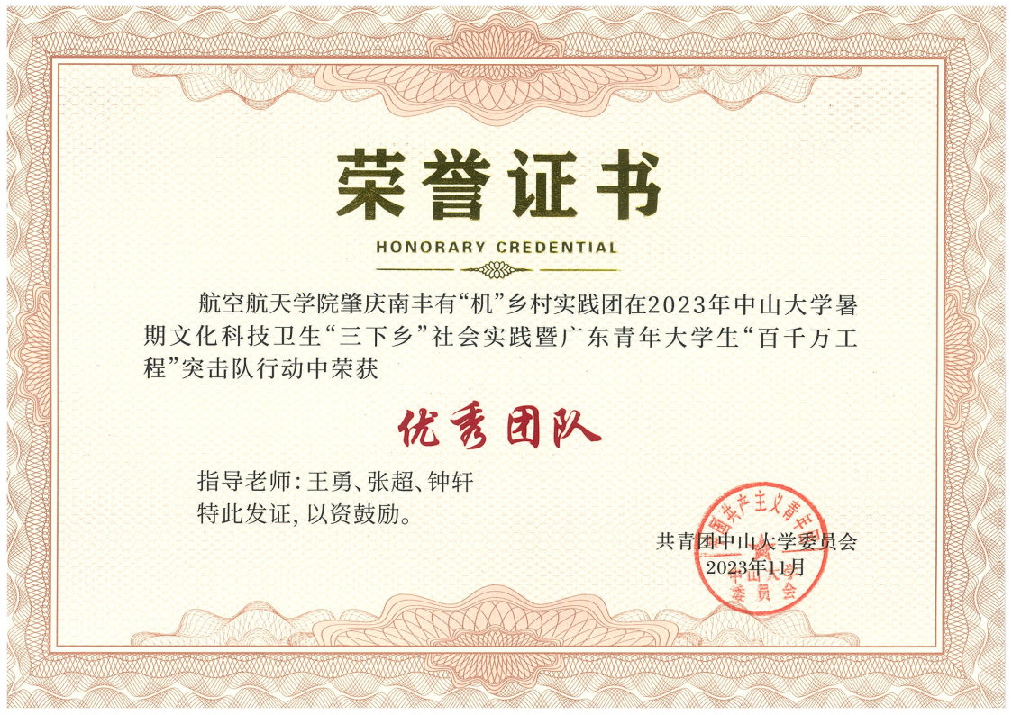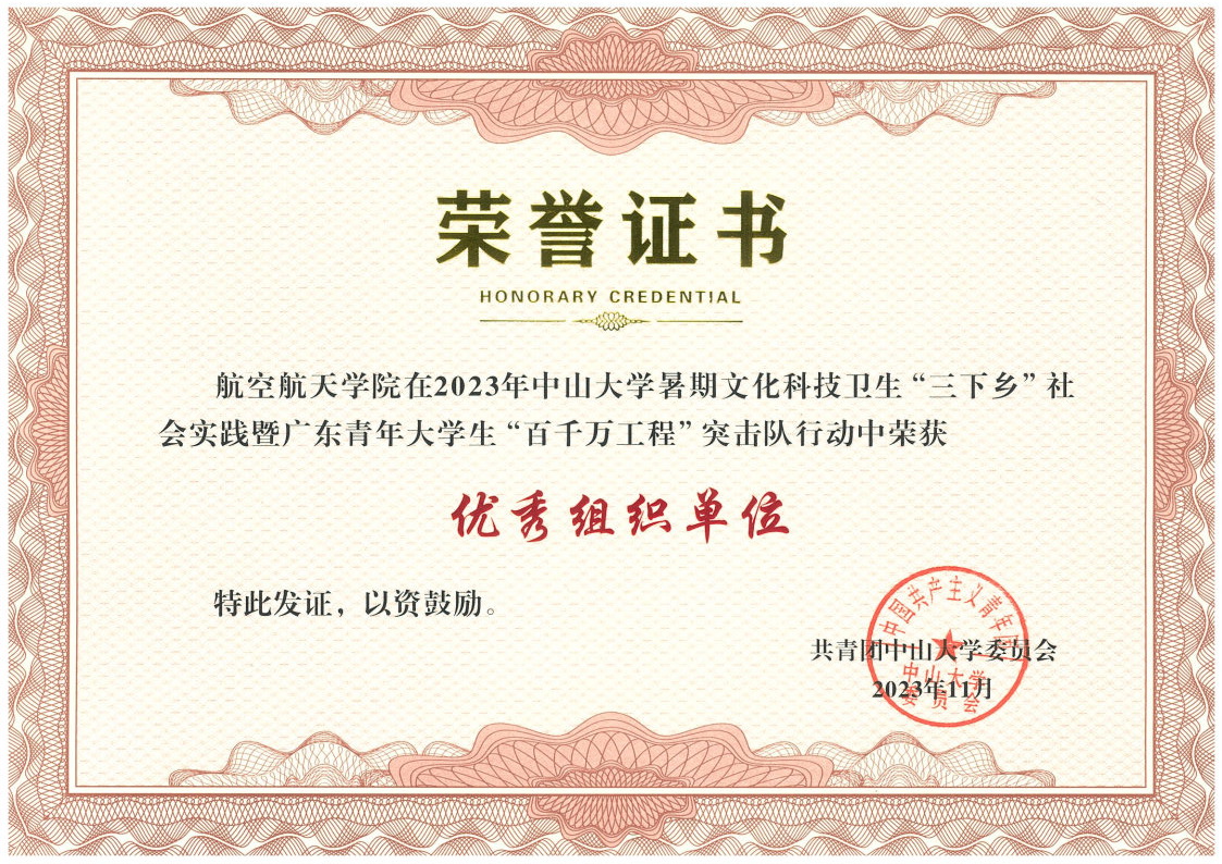 聚焦社会实践,弘扬志愿精神。2023年,我院“百千万工程”社会实践项目《有“机”乡村——无人机自动巡检系统助力智慧农业》获评广东青年大学生“百千万工程”突击队首批100个示范项目、广东省重点团队、中山大学广东青年大学生“百千万工程”突击队行动优秀团队。