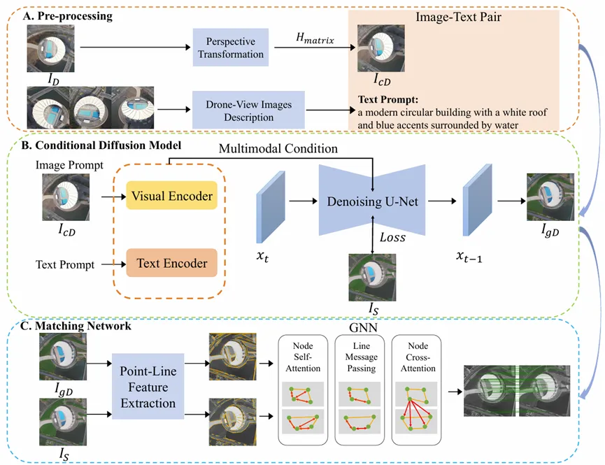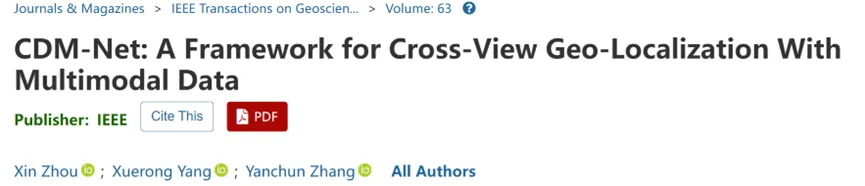 为了解决这一问题,该研究提出了 CDM-Net 跨视角地理定位框架(如下图),将多模态遥感信息融合与几何结构特征匹配相结合,为 CVGL 领域提供一种新的研究思路。该框架先对无人机图像进行透视变换与遥感图像描述,再以多模态遥感信息为条件生成接近卫星视图的无人机图像,最后通过点线特征匹配实现跨视角定位。日前,该研究成果以“CDM-Net: A Framework for Cross-View Geo-Localization With Multimodal Data”为题,在遥感领域顶刊 IEEE Transactions on Geoscience and Remote Sensing (中科院一区,IF=8.6)发表,博士生周鑫为第一作者,中山大学杨雪榕教授为通讯作者。