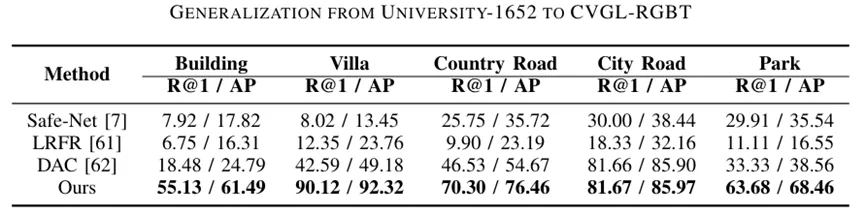 表 | 从 University-1652 泛化至 CVGL-RGBT 的实验结果