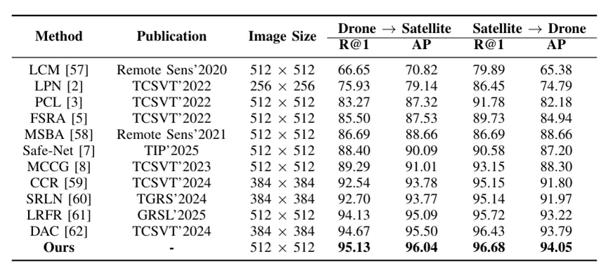 表 | 与近年来在 University-1652 上的STATE-OF-THE-ART 方法对比