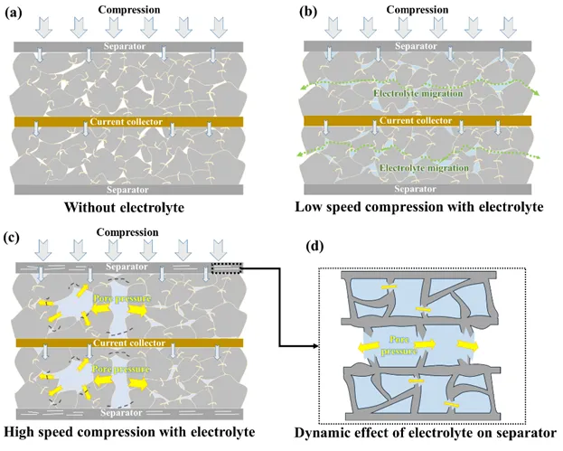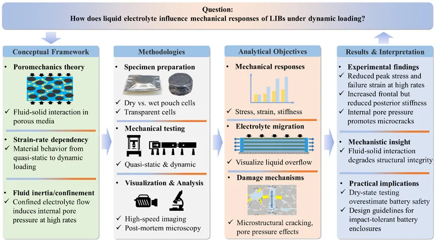 锂离子电池的发明与商业化,极大地推动了便携能源与电动交通的普及。然而,其广泛应用也伴随着严峻的安全挑战——尤其在电动汽车、电动垂直起降飞行器等高速运载工具中,碰撞冲击导致的电池内部结构破坏可能引发内短路,进而触发热失控,对人员安全构成威胁。目前,力学测试仍是探究电池机械完整性与安全边界的主要手段。现有研究大多基于干燥环境或准静态条件,忽略了电解液在实际冲击过程中的关键影响。在多孔电极与隔膜的动态变形过程中,电解液与微结构之间复杂的流固耦合作用影响电池失效行为的机制尚不明确,已成为准确评估电池碰撞安全、设计有效防护措施的核心瓶颈。