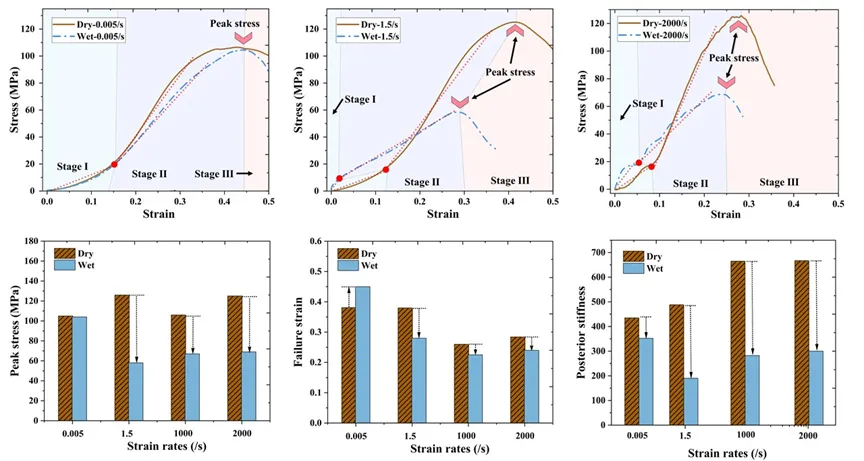 研究团队通过定制磷酸铁锂软包电池,结合准静态压缩与分离式霍普金森压杆冲击实验,覆盖了0.005/s至2000/s的宽应变率范围,系统对比了干燥与含电解液电池的力学行为。研究发现,电解液在高应变率冲击下,会显著削弱电池的承载能力,导致其峰值应力、失效应变和后段刚度明显下降;而在准静态加载中,其影响却微乎其微。这种“动态弱化效应”,与电池材料本身通常表现出的“应变率强化”行为存在明显区别。