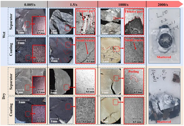 为揭示这一独特现象的物理机制,团队创新性地采用透明封装电池,首次实现了对电解液迁移过程的实时观测,并结合微观结构损伤分析发现:在高速加载时,电解液无法及时从多孔结构中排出,产生显著的内部孔隙压力。该压力对隔膜纤维和电极涂层颗粒界面施加了额外的拉应力,最终导致含液电池出现条带状隔膜减薄与涂层微裂纹——这些特征性损伤在干燥样品中并未出现。这一发现从微观层面证实,电解液在高应变率下的惯性效应与受限流动,是导致电池动态强度不升反降的关键。