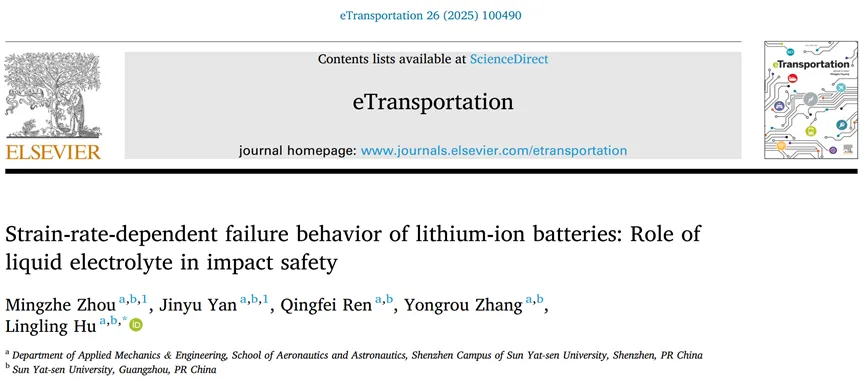针对这一问题,中山大学航空航天学院胡玲玲教授、周名哲副研究员团队以“Strain-rate-dependent failure behavior of lithium-ion batteries: Role of liquid electrolyte in impact safety”为题,在交通科学与技术领域顶刊《eTransportation》(IF=17,年发文量仅约100篇)上发表论文。该研究首次揭示了液态电解质在不同应变率下对电池力学响应与破坏模式的影响规律与机制,为电池的冲击安全设计与评估提供了关键实验依据与理论支撑。周名哲副研究员以及2023级硕士生颜瑾昱为文章的共同第一作者,胡玲玲教授为通讯作者。该研究得到了国家自然科学基金、深圳市基础研究重点项目、深圳市科技重大专项的资助。