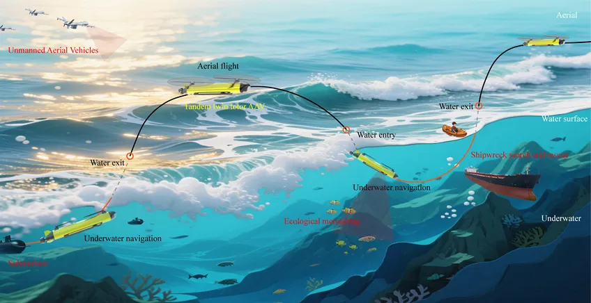 水空跨介质无人机(Aerial-Aquatic Vehicles, AAVs)作为新一代智能无人系统,在海洋监测、环境勘探和水上救援等民用领域展现出巨大的应用潜力。与此同时,随着现代海战向多维空间拓展,这类飞行器在军事侦察和登岛突防等任务中的应用价值也日益凸显。AAVs在空中、水面和水下跨域空间应用的可行性已初步得到验证,但其实际性能仍面临诸多挑战。特别是在复杂海洋环境中,AAVs易受海浪、风和洋流等动态外部因素的干扰,导致其机动性和稳定性难以满足实际应用需求。因此,实现AAVs在空海立体环境中连续高机动跨域稳定控制,将显著提升其在实际应用中的可靠性和实用性。