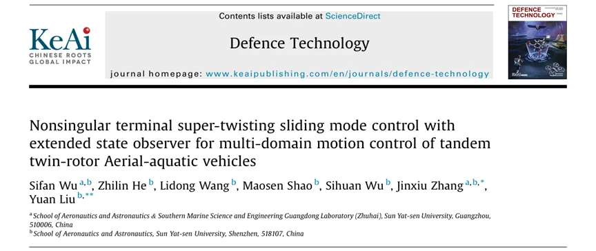 Wu S, He Z, Wang L, et al. Nonsingular terminal super-twisting sliding mode control with extended state observer for multi-domain motion control of tandem twin-rotor Aerial-aquatic vehicles[J]. Defence Technology, 2025.