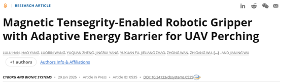 针对上述问题,中山大学吴志刚教授团队提出了一种基于磁力张拉整体结构的双稳态机械抓取器,利用磁力非线性特性实现自适应能量壁垒调制:在触发阶段呈现低能量壁垒以实现柔顺触发,在抓取保持阶段形成高能量壁垒以确保稳定抓取。研究成果以 “Magnetic Tensegrity-Enabled Robotic Gripper with Adaptive Energy Barrier for UAV Perching” 为题发表于 Cyborg and Bionic Systems 期刊(中科院一区,IF18.1)。中山大学航空航天学院2024级博士研究生韩路路、香港科技大学博士后研究员杨昊为共同第一作者,中山大学航空航天学院吴志刚教授、大连理工大学助理研究员张捷和中山大学先进制造学院吴嘉宁教授为共同通讯作者。