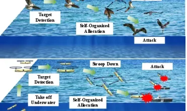 随着海洋资源开发和海上安全需求的不断提升,人们对无人系统提出了更高要求——不仅需要具备长航时监视能力,还要能够在复杂海洋环境中实现快速拦截与协同防御。双旋翼空水两栖飞行器(Dual-rotor Aerial-Aquatic Vehicle, DR-AAV)既可在水下实现隐蔽航行,又能够迅速跃出水面进入高速飞行状态。相较于传统无人机(Unmanned Aerial Vehicle, UAV)和无人水面艇(Unmanned Surface Vehicle, USV),DR-AAV展现出更强的任务适应性与环境适应能力。在集群部署模式下,DR-AAV集群具备开展协同伏击、动态跟踪以及联合围捕等复杂任务的能力,可用于应对对海域安全及关键基础设施构成威胁的无人水面艇集群。然而,DR-AAV严格的动力学约束、速度与姿态之间的强耦合特性,以及海上通信带宽受限条件下的分布式协同需求,使其在执行驱逐与围捕海上无人集群任务时仍面临诸多挑战。